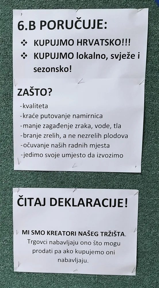 Učenici 6.b razreda svoje aktivnosti iz učionice dijelom su otvorili javnosti jer su izradili promjenjivi eko pano u atriju škole. Na taj način su ostalim učenicima, učiteljima i roditeljima poručili da je potrebno razmišljati o podrijetlu namirnica.