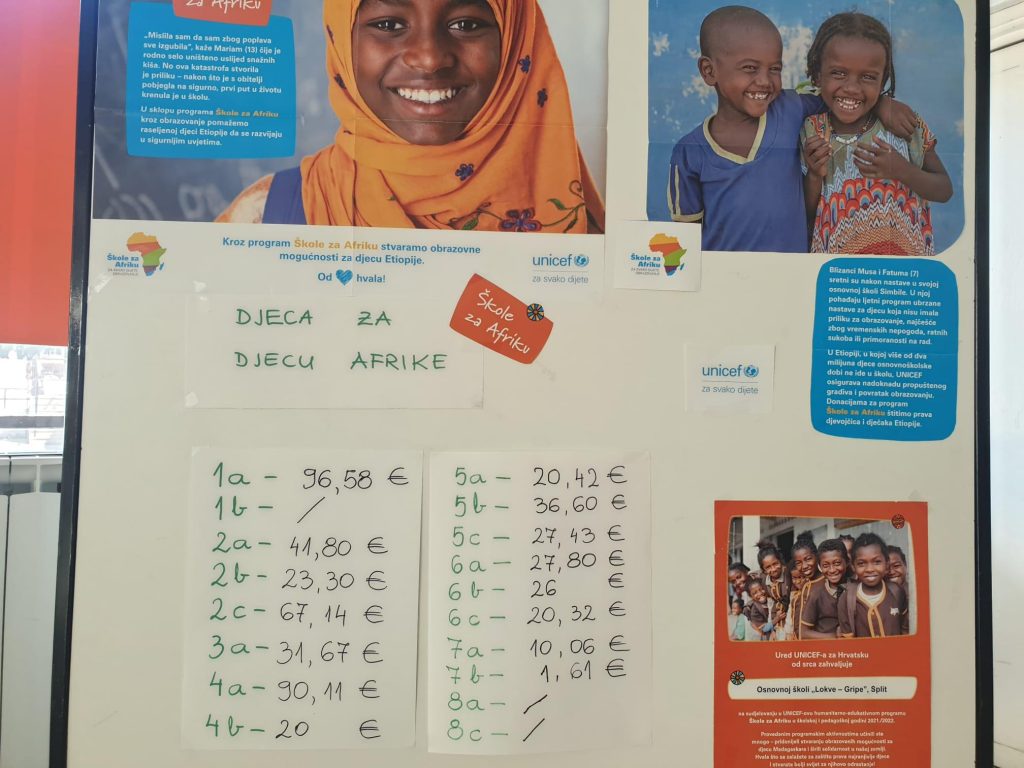 Unutar projekta Škole za Afriku tijekom godine prikupljala su se novčana sredstva te poticala u učenicima svijest o odgovornosti svakog pojedinca za društvo u cjelini nastojeći poslati poruku da je svaka kap u slapu bitna i da sitnim djelima pomoći činimo ogromnu razliku u svijetu. Učenici naše škole prikupili su ukupno 540, 84 eura za djecu Afrike.