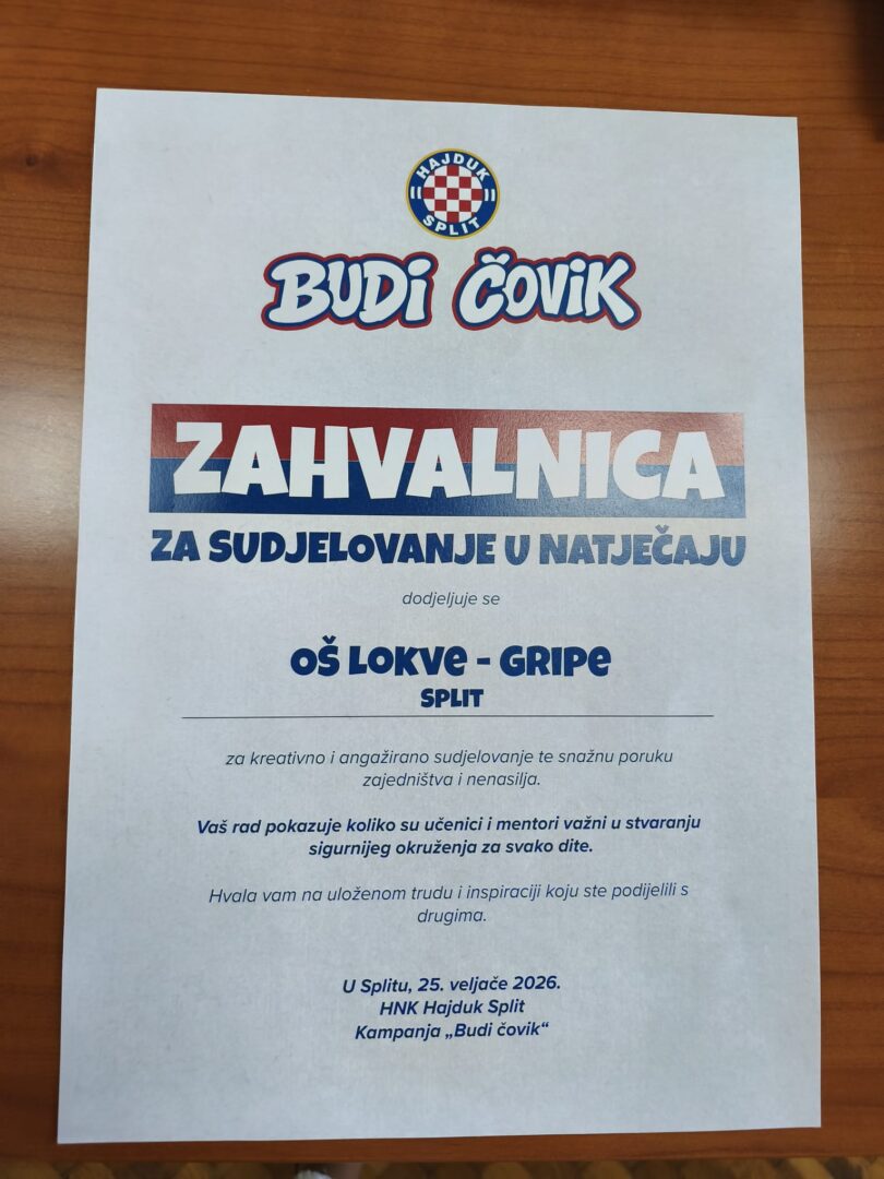 Učenici 3.b razreda naše Škole sudjelovali su u kampanji Budi čovik koju je organizirao Nogometni klub Hajduk u suradnji s nizom institucionalnih i stručnih partnera, među kojima je i Ministarstvo znanosti, obrazovanja i mladih. Kampanja je provedena u svrhu borbe protiv vršnjačkog nasilja. U aktivnostima su sudjelovali i roditelji i učiteljica.